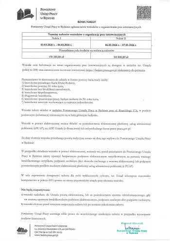 Powiatowu Urząd Pracy w Będzinie informuje, że nabór wnioskow o organizowanie prac interwencyjnych zostaje wstrzymany z dniem 04.03.2026 r.