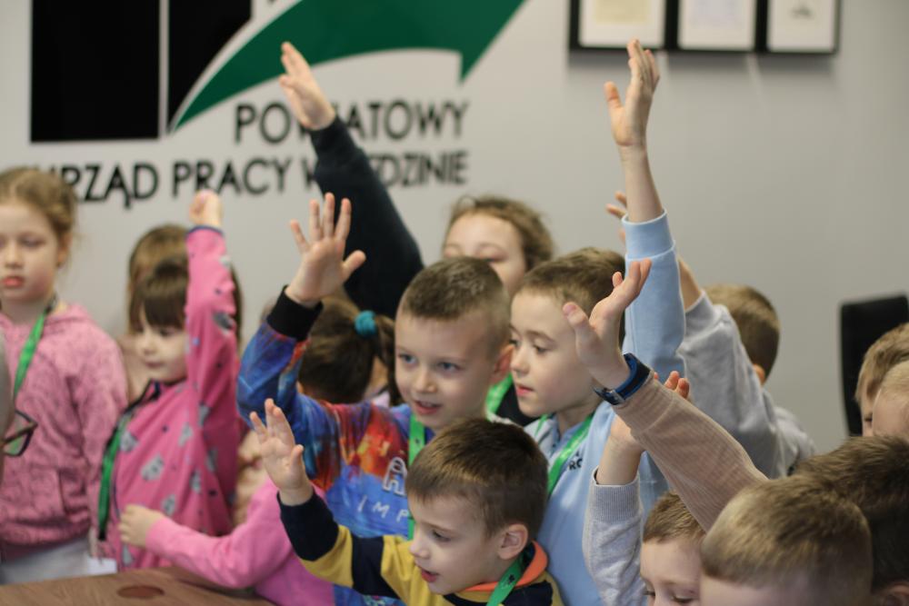 Podczas wizyty w naszym Urzędzie dzieci przywitał także Zastępca Dyrektora do spraw Organizacyjno-Administracyjnych Pan Rafał Kubicki, a oprowadzała je Doradczyni Zawodowa Marta Staroszyńska. Dzieci mogły poznać specyfikę pracy doradcy zawodowego, pobrać numerek systemu kolejkowego, a także opowiedzieć nam, kim chciałyby zostać w przyszłości:)