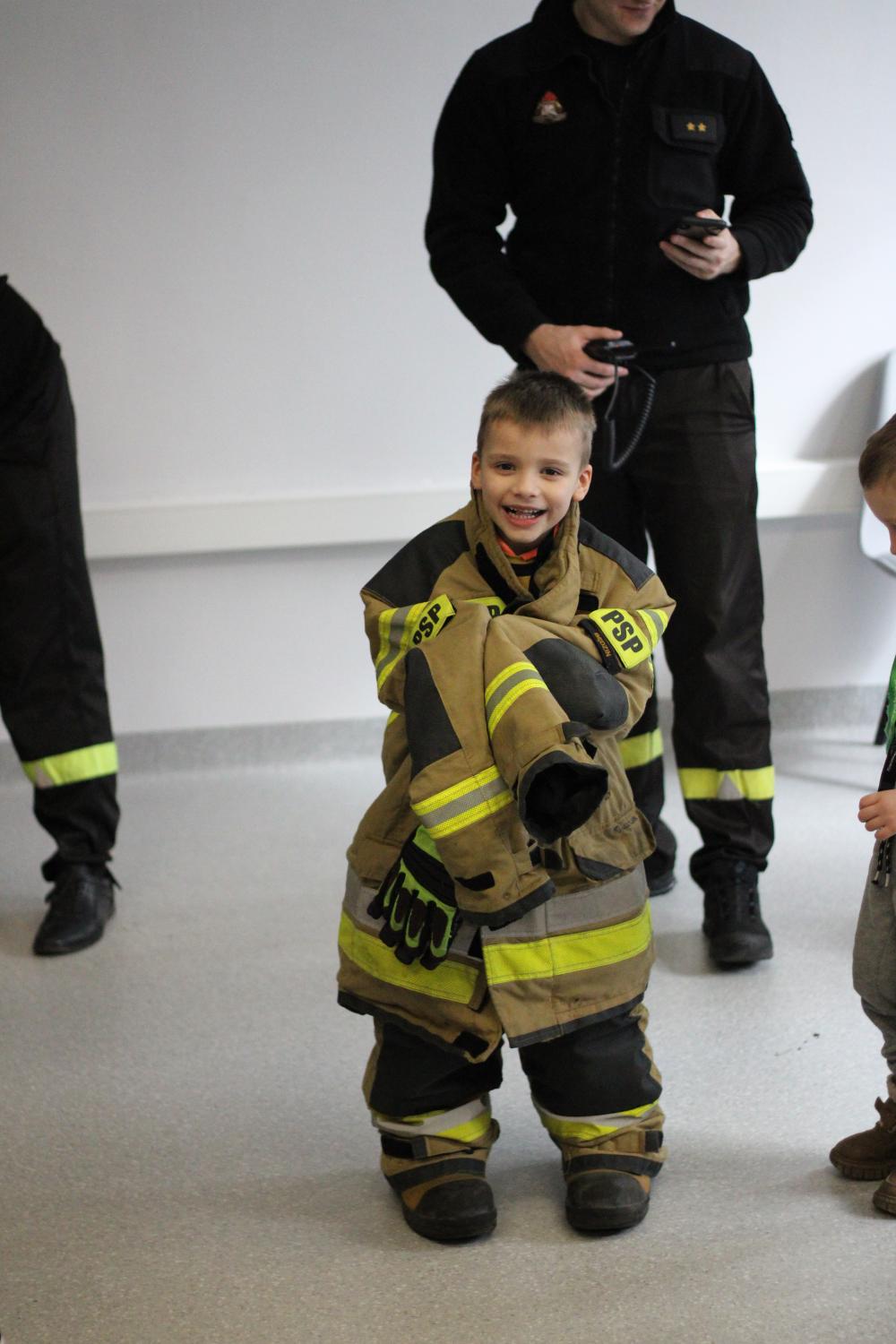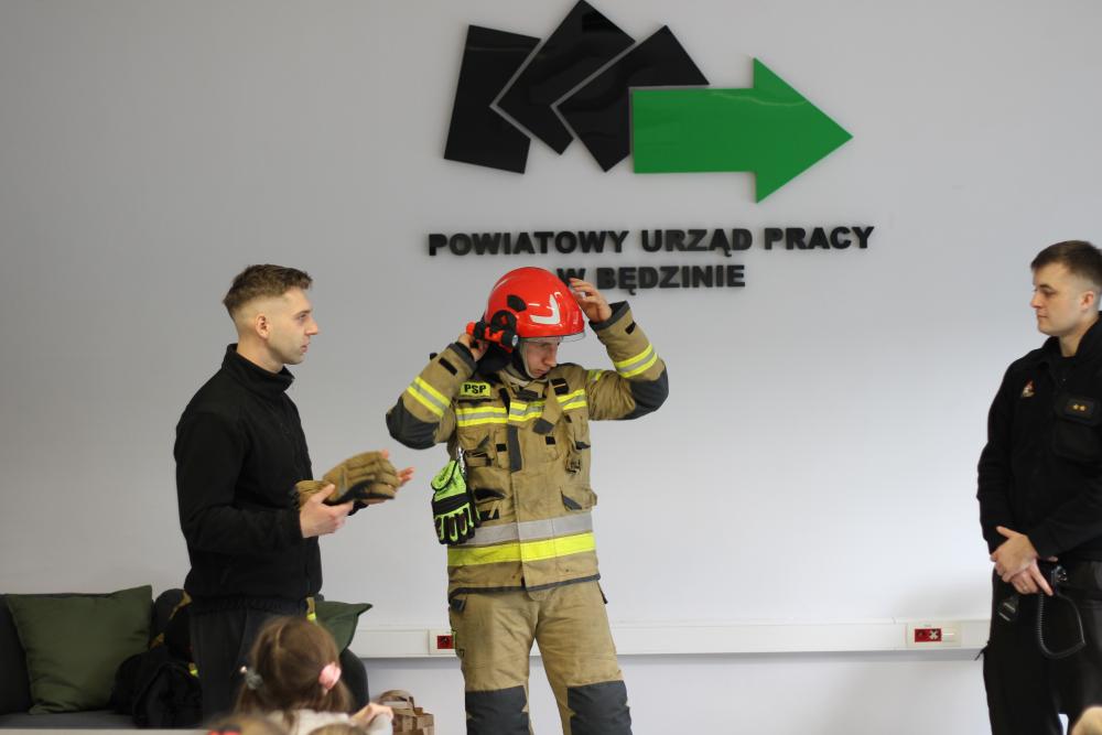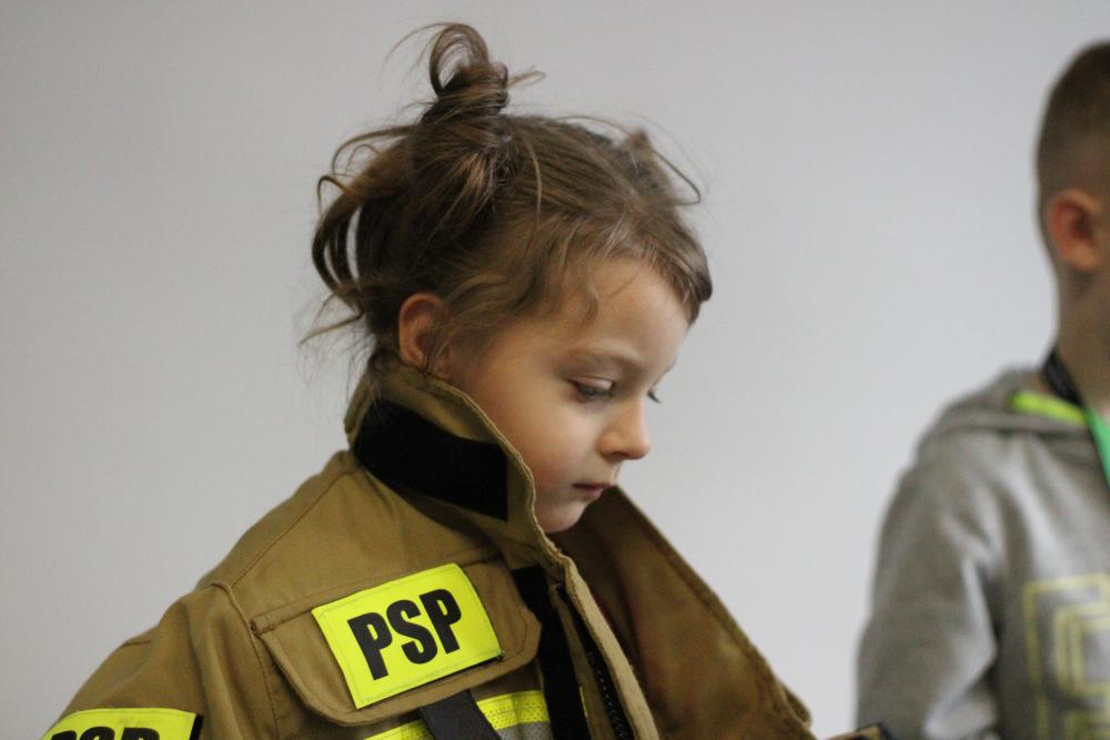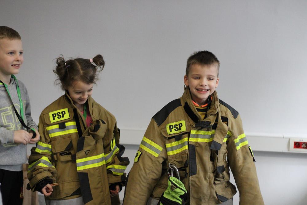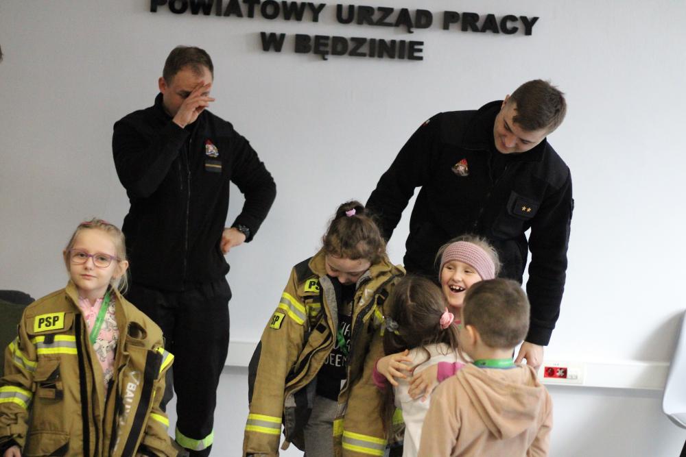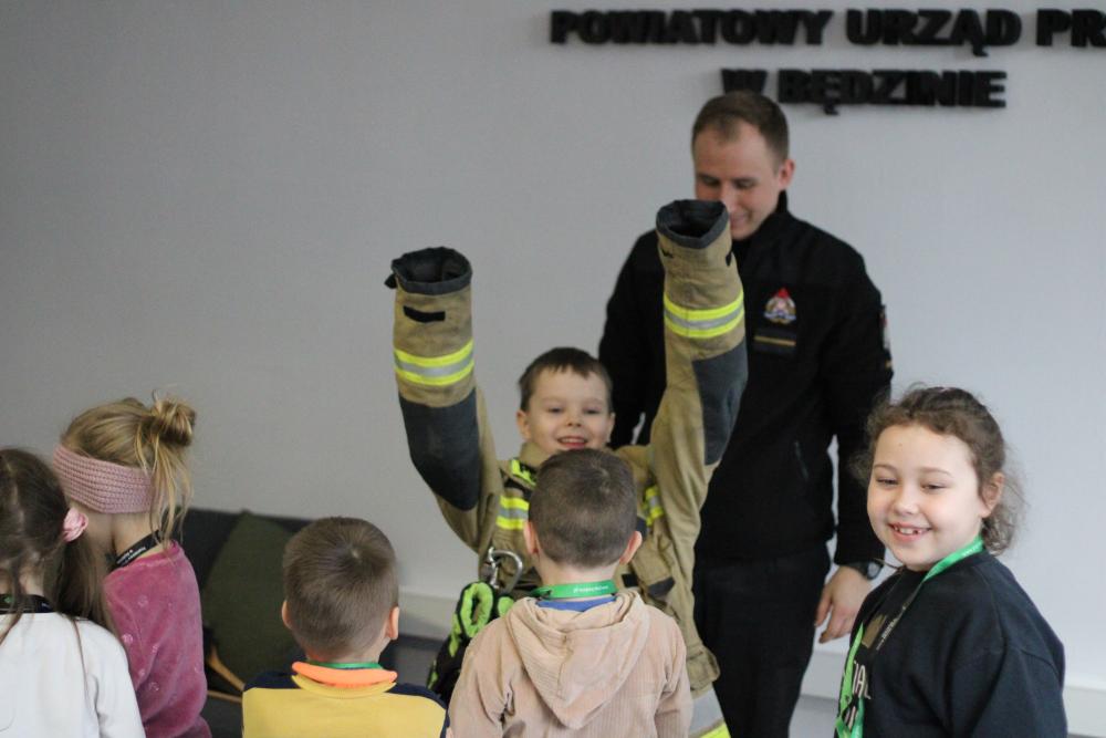 Specjalną niespodzianką było spotkanie ze strażakami z Komendy Powiatowej Państwowej Straży Pożarnej w Będzinie. Nasi goście zaprezentowali ekwipunek, który mają na sobie podczas akcji gaśniczej, opowiedzieli także o tym, jakie zwierzęta ściągają z drzew najczęściej, a także zdradzili co trzeba zrobić, żeby zostać w przyszłości strażakiem!